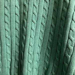 Elegant teal sweater with classic cable knit. V-neck design. Perfect for layering.
