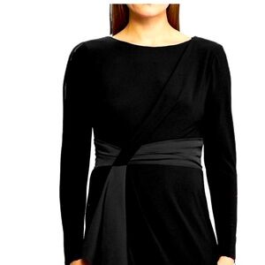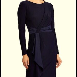 This sophisticated jersey dress is paired with an elegant satin-trimmed waist and ruffle trim at the skirt for stylish dimension.