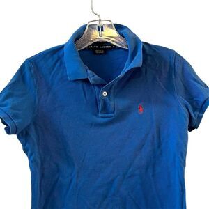 Keywords: Ralph Lauren, women's polo, blue shirt, medium size, slim fit, short sleeve, cotton polo, casual wear, collared shirt, spring fashion, logo accent, breathable fabric, comfortable fit, machine washable, Bolivia made.