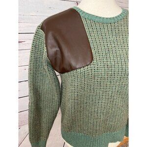 Lauren Ralph Lauren Wool Blend Sweater size Medium. Black label Ralph Lauren with leather elbow patches and detail on shoulder. Made in China. 60% Cotton 30% Nylon 10% Wool. Pit to end of sleeve 20.5", pit to pit 20", back bottom of collar to bottom of shirt 21.5". Hand wash. Great preowned condition with no rips or stains. Color is forest green crayola. Perfect for the outdoors cold weather snow ski business casual working career woman.