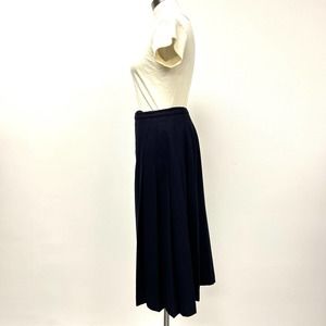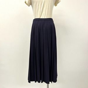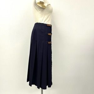 Very dark navy amazing pleated wool skirt with three leather buckles along one side and frayed edge. Super classic RL style. Vintage size 6.