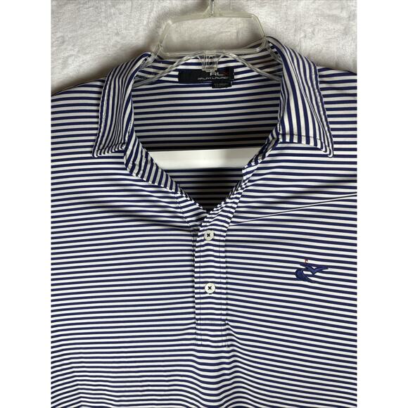 The Ralph Lauren X Shirt for men is a classic and preppy striped polo with short sleeves, featuring a collared neckline and button closure. This breathable shirt is suitable for all seasons and occasions including golf, travel, work, casual wear, workwear, and formal events. The shirt is adorned with embroidered logo detailing, showcasing the signature Ralph Lauren character, and comes in a large size with a regular fit. Perfect for sports activities like rugby or golf, this iconic polo is machine washable and easy to care for.