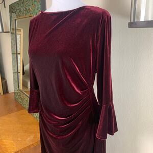 Ralph Lauren XL Velvet Ruched Stretch Dress Wine Red Bell Sleeve Formal Holiday