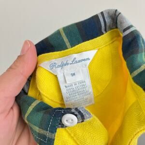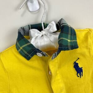Ralph Lauren Yellow Striped Polo Shortall Romper. Baby boy size 9 months. Cute and simple one piece coverall outfit for summer! Bright yellow with green plaid collar. Snaps at the crotch for easy diaper changes. Big embroidered polo pony on chest. Minuscule pinhole at snaps, but otherwise great condition!