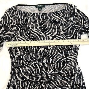 Ralph Lauren dress, zebra print dress, abstract stripe dress, long sleeve jersey dress, Ralph Lauren size 6, stretch knit dress, black and white print dress, ruched bodycon dress, fall winter dress, pull-on dress, chic animal print, office to evening dress, fitted sheath, dressy casual dress, boat neck Ralph Lauren, classic printed dress, zebra stripe stretch, bold pattern dress, monochrome dress, signature print Ralph Lauren