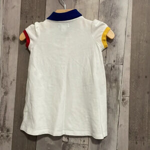 Short sleeve white polo with large logo and primary colored ringers and neck