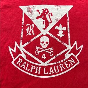 Bold Ralph Lauren hoodie with red body and dark Navy thermal sleeves. Features iconic logo design. Ideal for casual wear. Worn