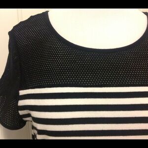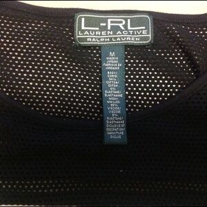 Great looking Lauren Active tee . Black stripes with mesh yoke and sleeves. Stretchy cotton blend with herringbone logo tab with L-RL engraved on rivet at lower left hem . Measures 18” armpit to armpit and 26" top to bottom.size M