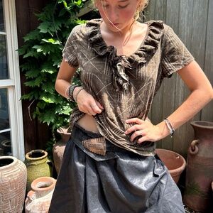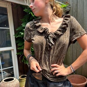Ralph Lauren brown Kenyan African Ethnic Print ruffle trim short sleeve knit top