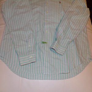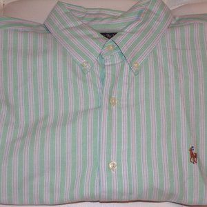 Ralph Lauren by Polo Men’s Long Sleeve Button Down shirt, slightly used but in excellent condition. Bright Green, White and Pink strip shirt. Please see pictures for additional description. Thank you