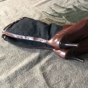 Ralph Lauren collection, purple label, made in Italy boots. Boots are knee high and have small ~2 inch heel, with buckle and English riding boots details. Side zipper. Boots have some scuff marks (leather cleaner would help hide) and the soles have wear on them. But still lots of life left. Great for fall