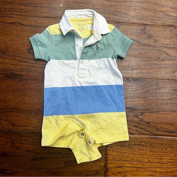 This Ralph Lauren bodysuit showcases a vibrant striped pattern in yellow and green, perfect for adding a pop of color to any wardrobe. Crafted from soft, lightweight fabric, it ensures comfort and breathability for warm weather. The short sleeves and classic design make it a versatile choice for various occasions.