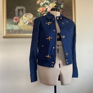Ralph Lauren gold zip and toggle navy blue cotton/stretch jacket. gold toggle close. versatile neckline can be worn up or folded down..gold accents