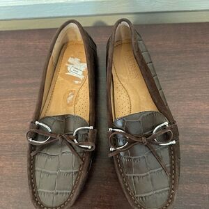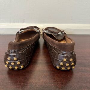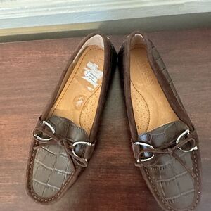 Crocodile-embossed leather gives this loafer an elevated look, while Lauren's stirrup-shaped hardware lends a signature equestrian touch. Rounded toe.