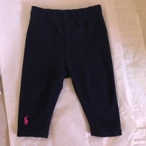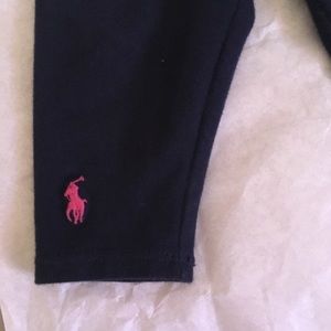 Infant's navy blue leggings with a pink polo symbol on the bottom. Worn a few times but are still in good condition. Size 6m. Comes from a smoke/pet free home.