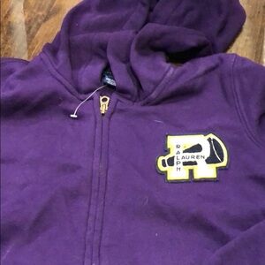Vibrant Ralph Lauren Purple Zip-Up Hoodie with Patch. This cozy purple zip-up hoodie features a prominent yellow and navy blue patch on the chest, showcasing the "Ralph Lauren" name and a distinctive logo. The rich color and classic design make it a comfortable and stylish layering piece for any casual outfit.