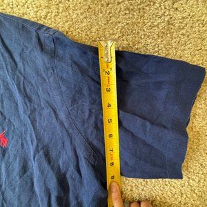 Dark Blue, Custom Fit, Size Large. Label Tag has three small holes, NO HOLES IN GARMENT, no stains, snags or tears. Just Wrinkled, but that can be fixed with a steam/Iron. I purposely do not steam, to protect quality of garment upon selling it. Measurements are reflected in the pictures and will be listed below.