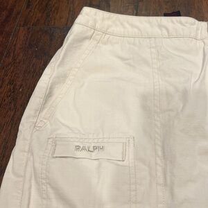 Ralph Lauren mini skirt in cream color size 2 100% cotton with 2 back pockets and 2 front pockets raw hem GUC