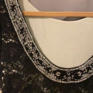 LBD with tags on! Beaded neckline drops low in back, soft stretchy black lace dress is fully lined with nude satin, except for arms. Gorgeous dress ready for the holiday party!