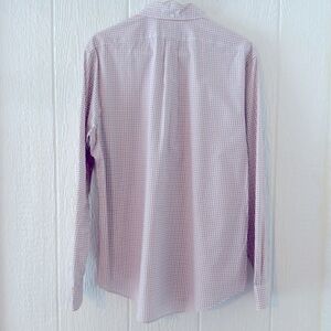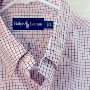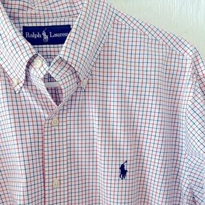 Classic Ralph Lauren style in a white base with red and blue plaid, finished with a blue embroidered polo logo. Long sleeves, button-down collar, and quality cotton fabric. Excellent pre-owned condition.