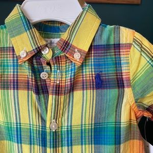 Adorable plaid short-all from Ralph Lauren. Yellow background with navy blue pony. Snaps at crotch. Fits 24-27 inches and14-18 pounds. 100% cotton. Perfect outfit for Easter!