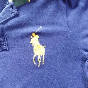 Navy blue polo with yellow horse and 3 on right arm. Size xl