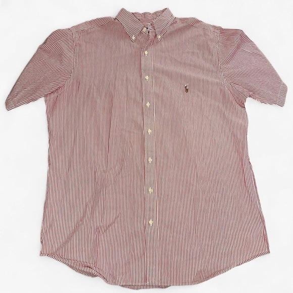 Ralph Lauren red and white striped short sleeve button up shirt. Ralph Lauren logo on chest.