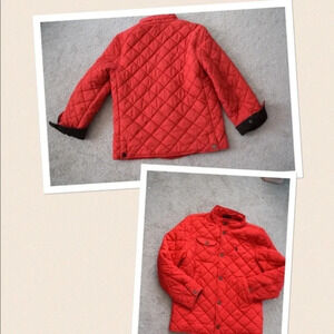 Sleeve length 22". Beautiful red quilted jacket! Brass tone buttons logo embossed