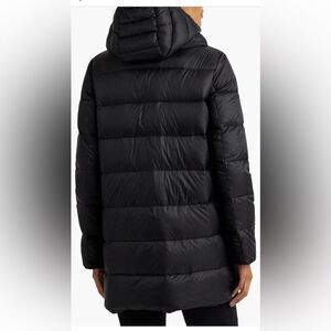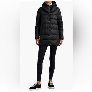 NWT, A bib insert adds practical warmth to the elegant shawl-collar style of an essential down puffer coat fixed with a cozy hood.