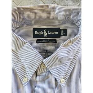The Ralph Lauren Blake Lavender stripe long sleeve cotton button shirt is a men's size large button-up shirt with a classic fit. Made of breathable cotton knit fabric, this gray shirt features a spread collar, striped pattern, and the iconic Ralph Lauren logo accent. Ideal for various occasions including casual, formal, and business events, this shirt is machine washable and easy to care for. The designer and preppy theme adds a touch of sophistication to this stylish and versatile piece, making it a timeless addition to any man's wardrobe.