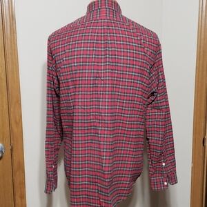 Long sleeve red and green plaid soft medium weight shirt classic fit size large logo on chest only issue with shirt is a name written on inside tag please see photos.