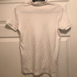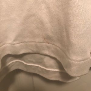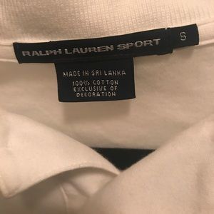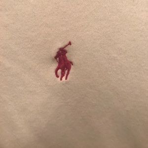 Ralph Lauren sport polo. White with hot pink horse. Size small. A little stretchy. Used condition. Small stain on bottom front, could probably be dry cleaned or bleached out.
