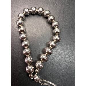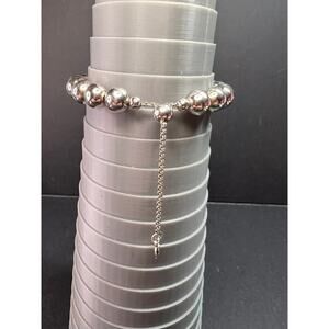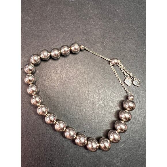 Authentic 925 sterling silver 8mm beads on a bolo chain with two sterling silver heart charms hanging stamped 925 RL Italy. This is possibly not Ralph Lauren but all searches I’ve done say it is Ralph Lauren based on the RL. Measures from about 5.75 to 9.5 inches. Completely adjustable with bolo slide. Total weight is 7.80 grams.