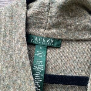 Stylish Ralph Lauren green sweater featuring brown leather accents. It is partial lambs wool, cotton, rabbit, and viscose.