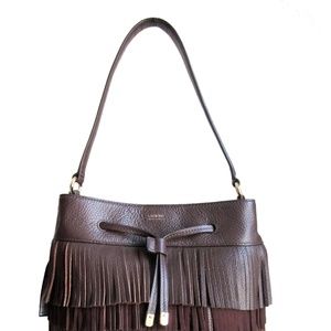 Layers of fringe shoulder bucket bag with just enough bohemian vintage fringe vibe featuring a dark brown genuine pebbled grain leather, drawstring closure by Lauren Ralph Lauren.