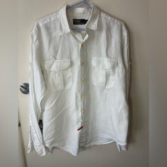 Stylish cream button down by Ralph Lauren. Features dual chest pockets. Ideal for casual outings. little use