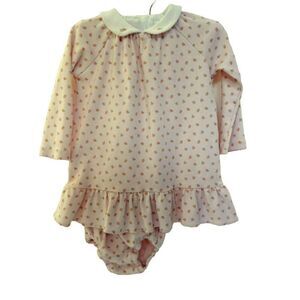 Ralph Lauren: 2 Piece Pale Pink Mini Floral Dress with Matching Bloomers, 100% Cotton, Machine Wash & Dry, Ruffled Tunic Top Dress, Peter Pan Embroidered Collar, 4 Logo Buttons on Back.