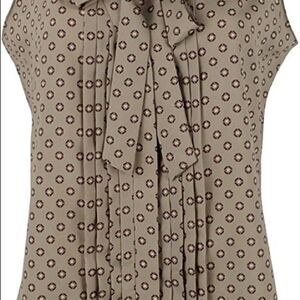 Green label Ralph Lauren Women's foulard-print georgette top that features a pleated front and v-neck with a tie. Concealed buttoned placket. Sleeveless silhouette. Curved hem. Size Medium