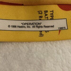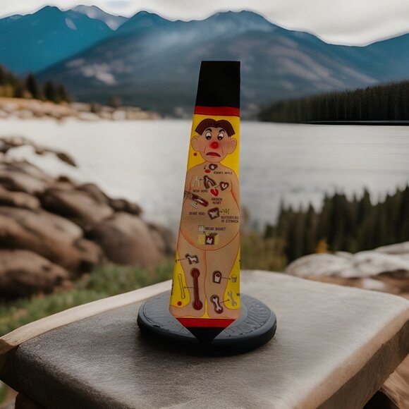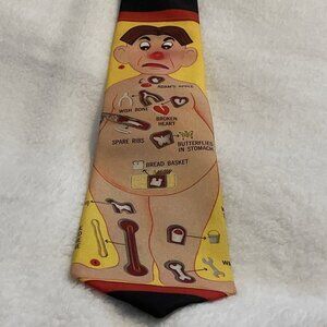 The product is a vintage collectible Ralph Marlin Operation Game tie from 1996, featuring a novelty print with an Operation game image. Made in the USA, this designer necktie is standard size, multicolor woven polyester fabric with a classic width. Perfect for men who appreciate vintage board games and unique accessories, this tie is a nostalgic piece that adds a touch of fun and character to any outfit. 3.75”x56.75”