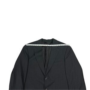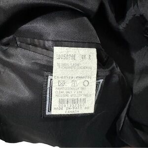 The jacket is fully lined with polyester and has a ventless style. It is a vintage piece and is in excellent used condition. The jacket has four-button sleeve button style and two front pockets. This suit jacket requires dry cleaning only. It is perfect for weddings, parties, cocktail events, and business occasions.