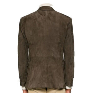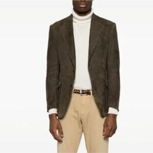 Elevate your style with this sophisticated olive green suede blazer. A timeless piece that exudes confidence and refinement, this jacket features a classic two-button design, notched lapels, and flap pockets, offering both style and functionality. The supple suede material adds a touch of luxury and texture, making it a standout addition to your wardrobe. Perfect for a business-casual setting, a night out, or a special event where you want to make a lasting impression.