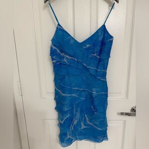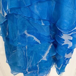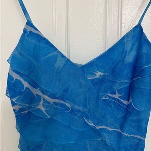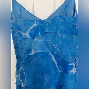 Ralph Lauren black label 100 silk dress in blue with white swirl. Features spaghetti straps, high V neck, diagonal ruffles throughout, hidden side zipper and full lining.