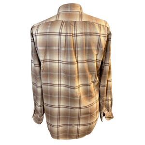 This shirt features a brown and cream plaid pattern, long sleeves, cotton flannel, long sleeves and button-down front with a collar. Size M.
