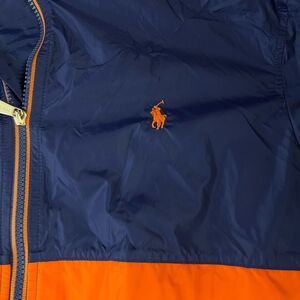 Vibrant Ralph Lauren windbreaker with blue, green, and orange colorblock design. Ideal for outdoor adventures.