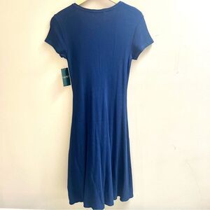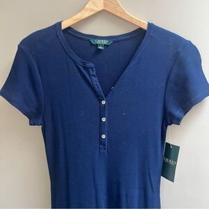 Sophisticated navy midi dress by Ralph Lauren. Features a sleek silhouette with button details. Ideal for any occasion.