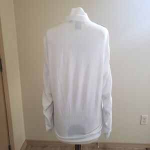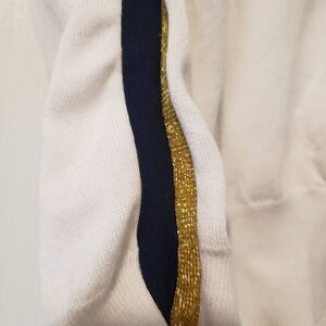 Ralph Lauren Golf Sweater M. Retail $225. Sweater is white with navy and gold metallic stripes on the sleeves. Gold-toned zipper in front. Handwarmer pocket in front. Never worn, just washed. Approximate measurements with with zipper closed: 21" chest measuring from underarm to underarm, 29" long measuring from back collar to hem. 81% cotton, 17% nylon, 1% elastane, 1% Metallic. Extra roomy and so cool!