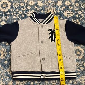 Ralph Lauren Gray Blue Bear Graphic Varsity Button Closure Jacket. Size 9 months, has pockets, please note; has signs of wear.