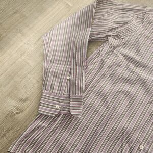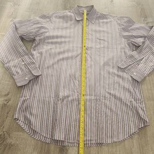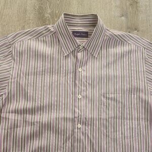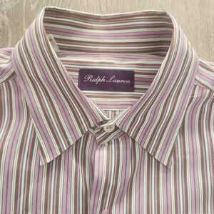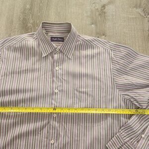 Mens Ralph Lauren Purple Label Button Up Long Sleeve Dress Shirt. Pink, Purple & White striped. Size Large. Made in Italy. 100% Cotton. Pit-to-pit 24", Collar-to-Hem 32", Sleeve length 26". No rips, tears or stains. See photos for condition.