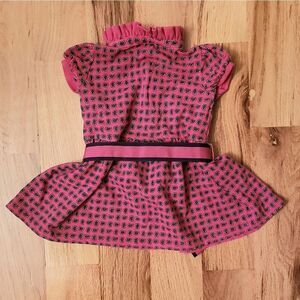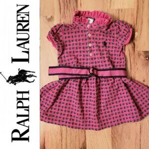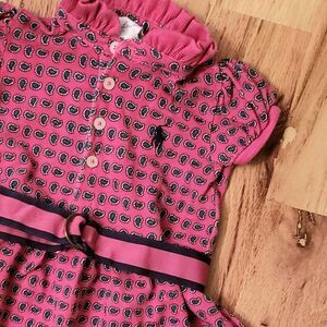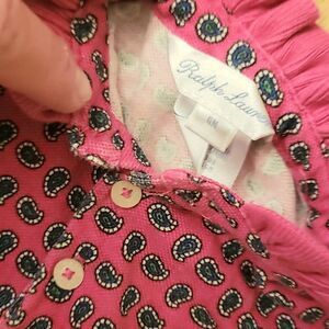 Excellent used condition. This dress is just darling! It is a shirt dress style with poof sleeves and a ruffle stand up collar. Blue paisleys all over on a hot pink fabric. Pull belt at the waist for that extra special touch. Looks more like a Ralph Lauren Black Label than the general RL. Size 6 months