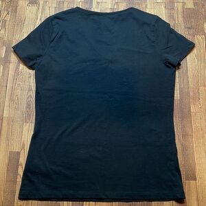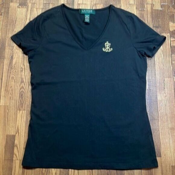 Ralph Lauren women’s black V-neck, short sleeve T-shirt. Excellent used condition. No stains. No holes or tears. No pilling or fading. 100% cotton. Gold trim. Same day shipping Monday through Saturday. Open to reasonable offers.